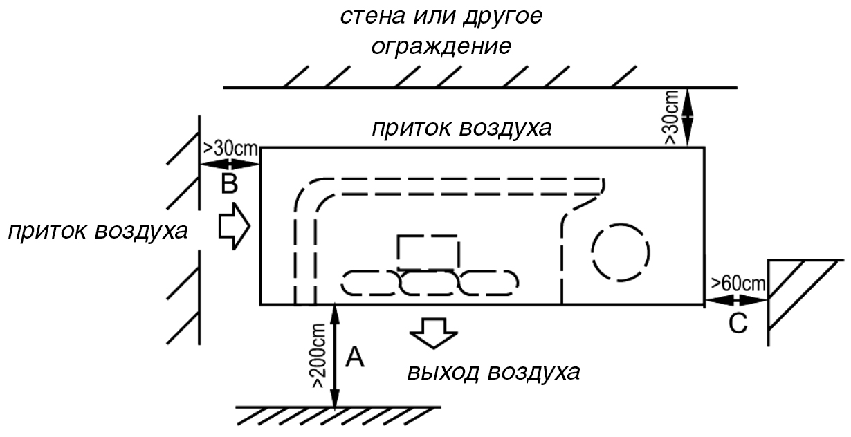- Направление выходящего воздуха на своем пути не должно встречать никаких препятствий.