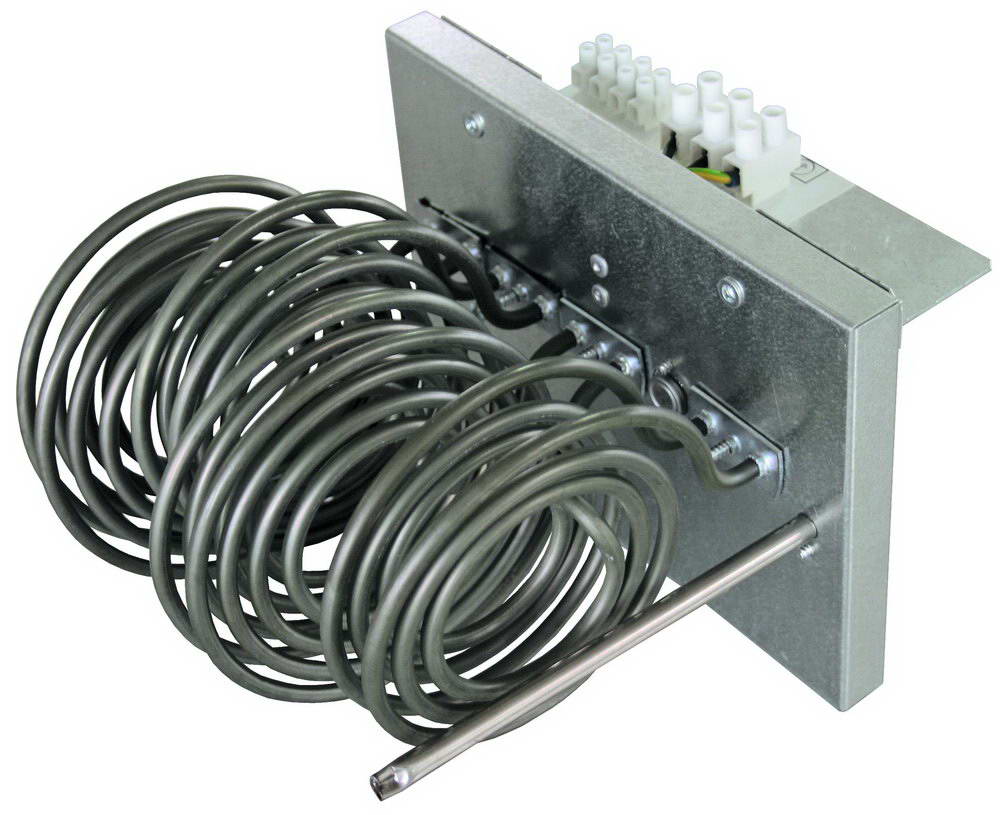 Электронагреватель закрепляется при помощи специальной прижимной планки и 4 саморезов. Внутри вентиляторного блока предусмотрен разъем защищенный от ошибки при присоединении, в который подключается ответный штекер электронагревателя. Подключение питания электронагревателя осуществляется через клеммную коробку, расположенную на корпусе блока.
