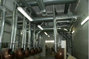 Вентиляция производственных цехов требует учета многих специфических условий, главное из которых – учет типа производства. Если производство связано, например, с выделением большого количества пыли и тепла, то в этом случае устанавливаются мощные вентиляторы, задачей которых будет удаление выбросов из цеха и отвод излишнего теплового излучения. На предприятиях подобного типа обычно используются воздуховоды больших диаметров (до 6 метров). Кондиционирование в таких цехах экономически нецелесообразно и поэтому достаточно установки только вытяжной вентиляции.